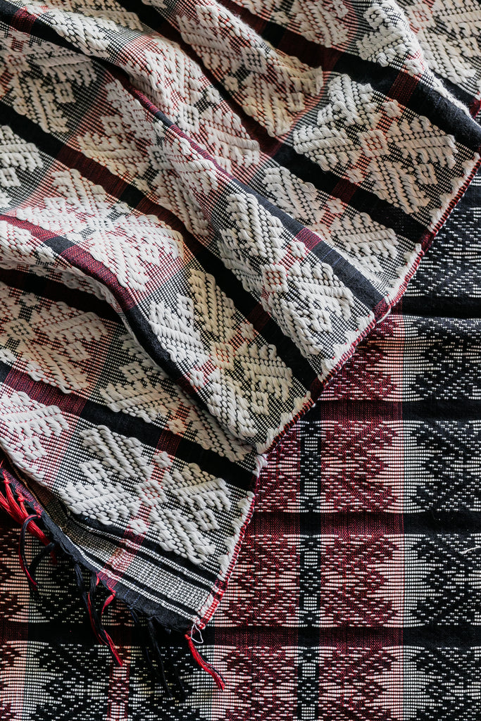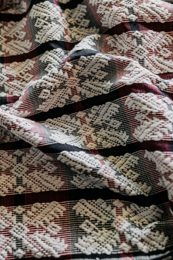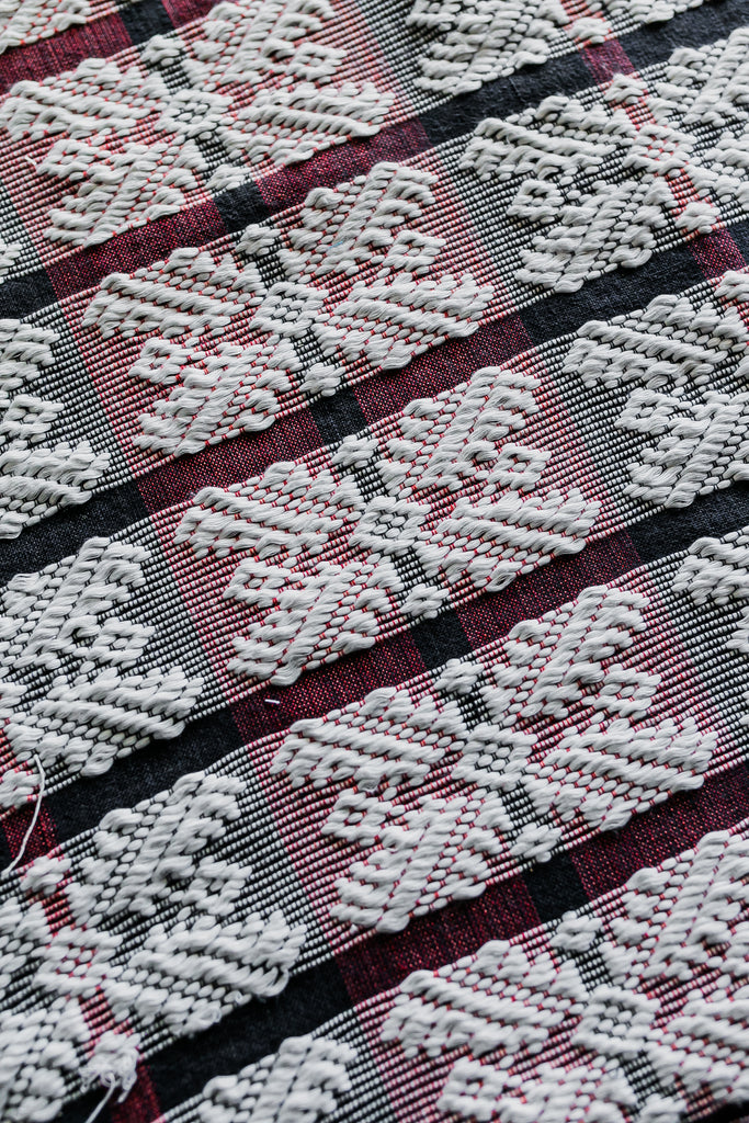 This Pinilian weave showcases the masterful skills of the weavers in Santiago, Ilocos Sur with its complex brocade-like weave. Sticks are inserted on the chosen warp embroidered in a traditional vertical loom to achieve an embroidered-like texture and look. This variation of the Pinilian weave features a sizeable geometric figure dubbed "larger diamonds" that make for a bold pop of color.